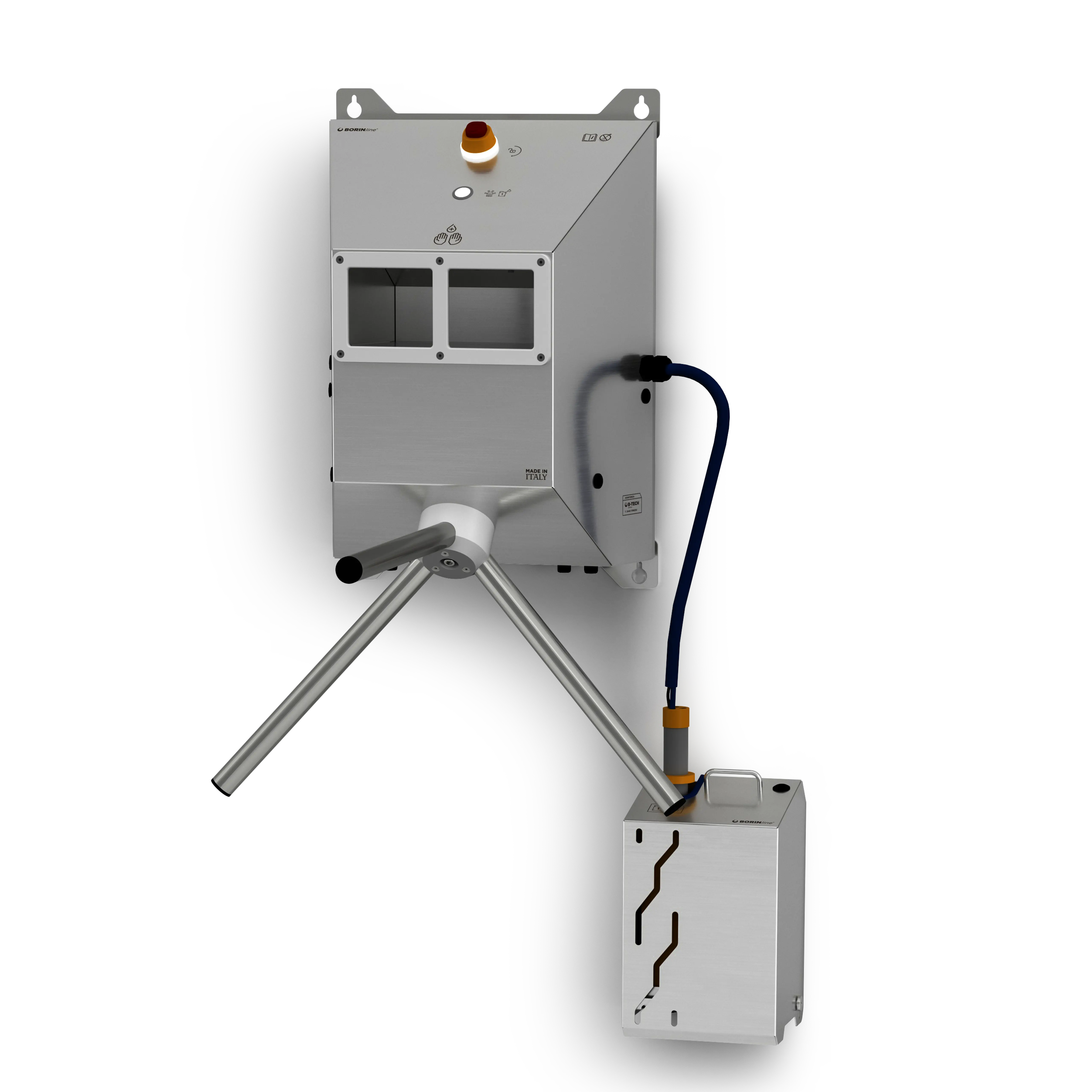 Stazione igienizzante pensile per la sanificazione o saponatura delle mani con controllo accessi. La procedura è automatica e guidata: nebulizzazione di prodotto a base alcolica oppure erogazione di sapone e, a erogazione completata, sblocco del tornello. In caso di mancanza di corrente, il tornello rimane sbloccato consentendo il passaggio.