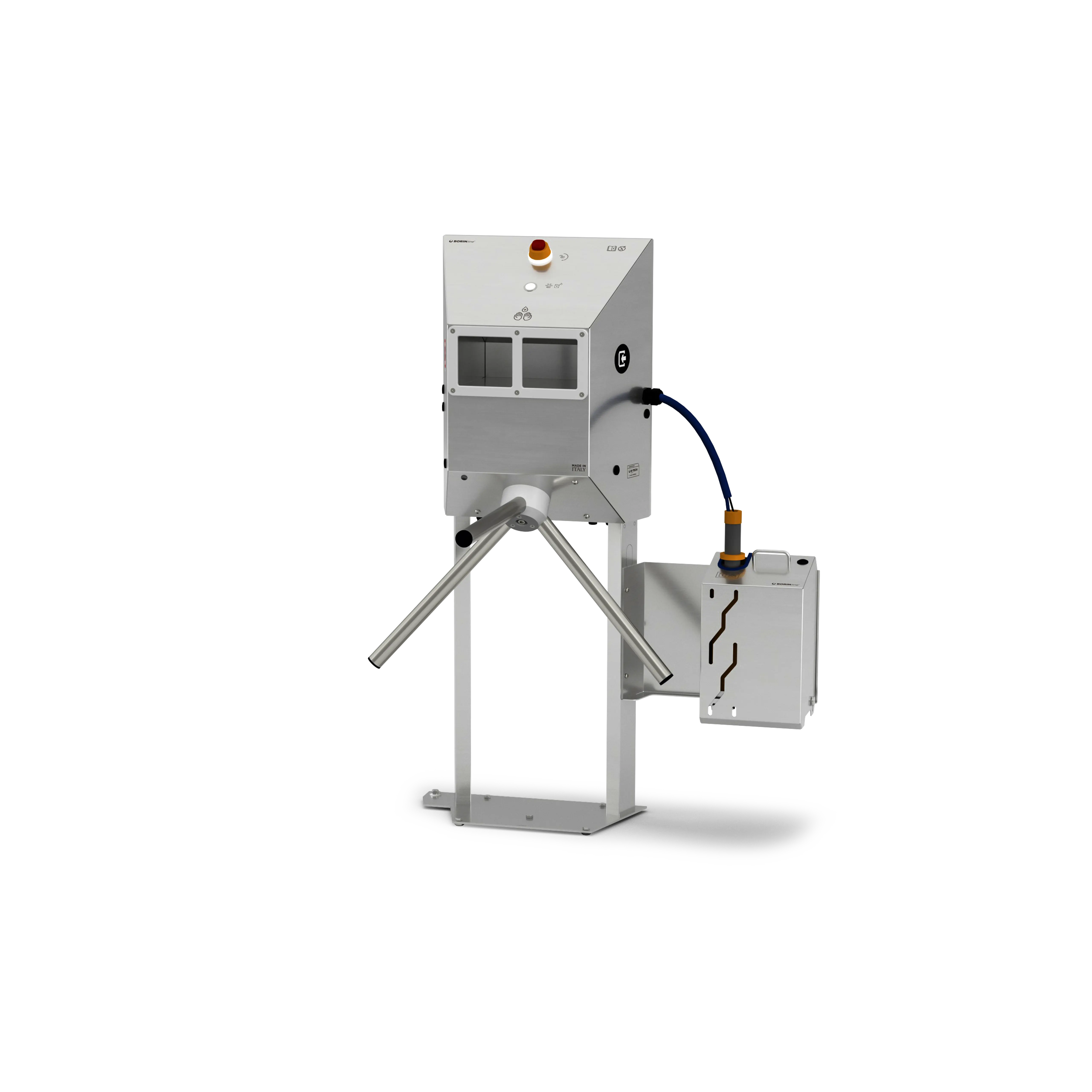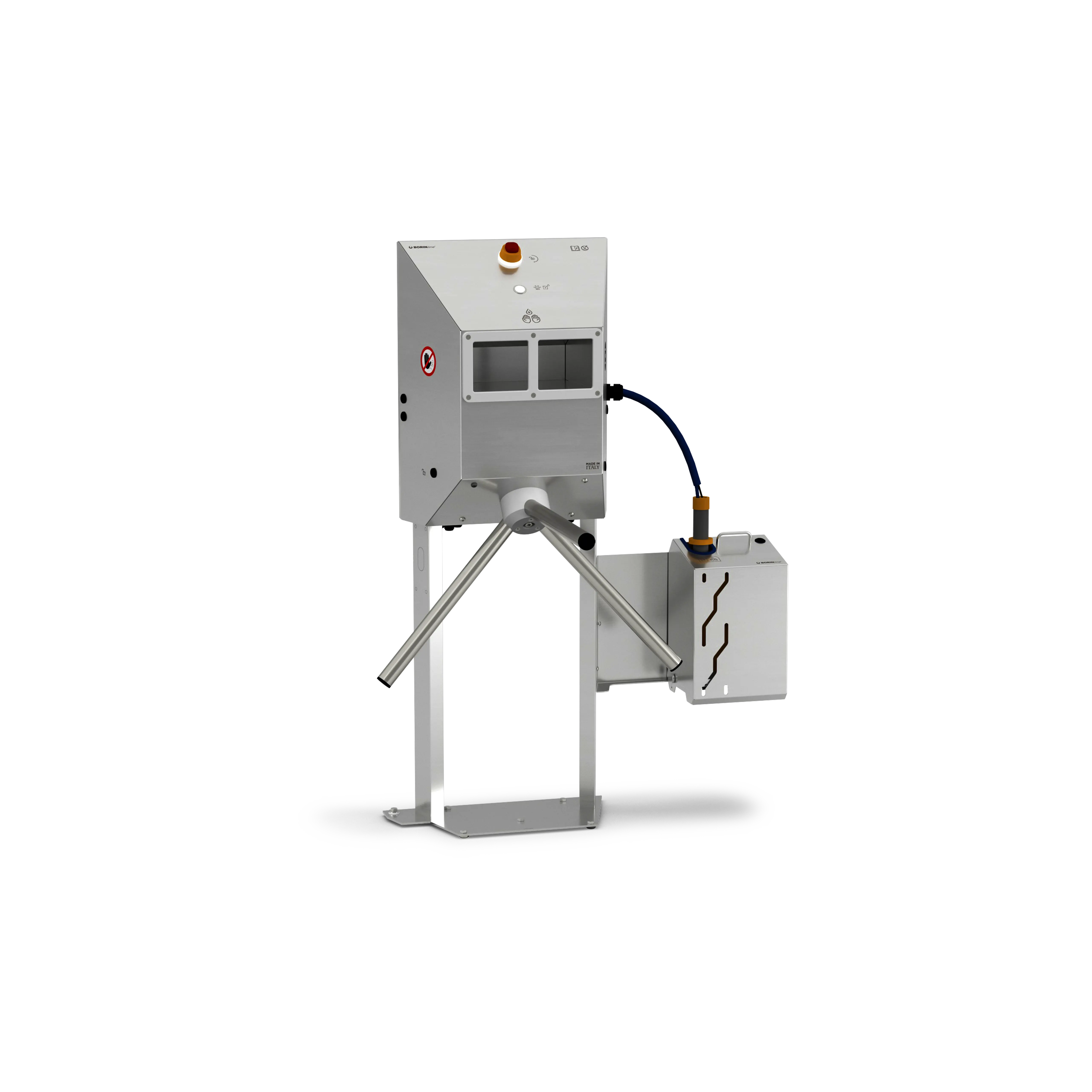 Stazione di sanificazione delle mani con controllo accessi: certifica la saponatura delle mani degli operatori in ingresso e in uscita dalle aree di lavoro. La procedura è automatica e guidata: saponatura delle mani con rilascio automatico di sapone disinfettante e, a erogazione completata, sblocco del tornello. In caso di mancanza di corrente, il tornello rimane sbloccato consentendo il passaggio.