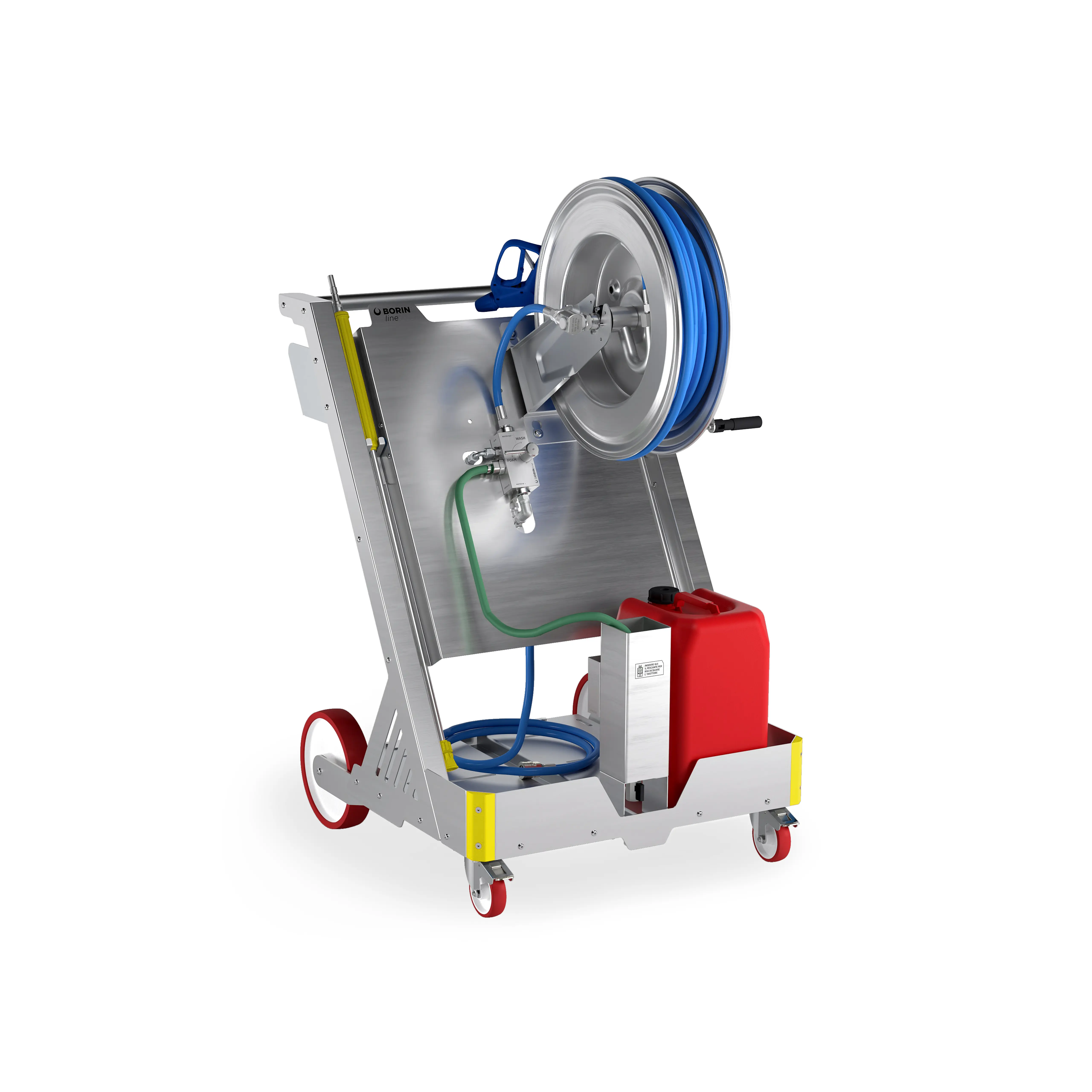 Completo di avvolgitubo a manovella per mantenere la linea ordinata durante spostamento e utilizzo, organizza la distinzione tra reparti tramite codice colore giallo, con paracolpi e kit lance abbinati secondo logica HACCP.