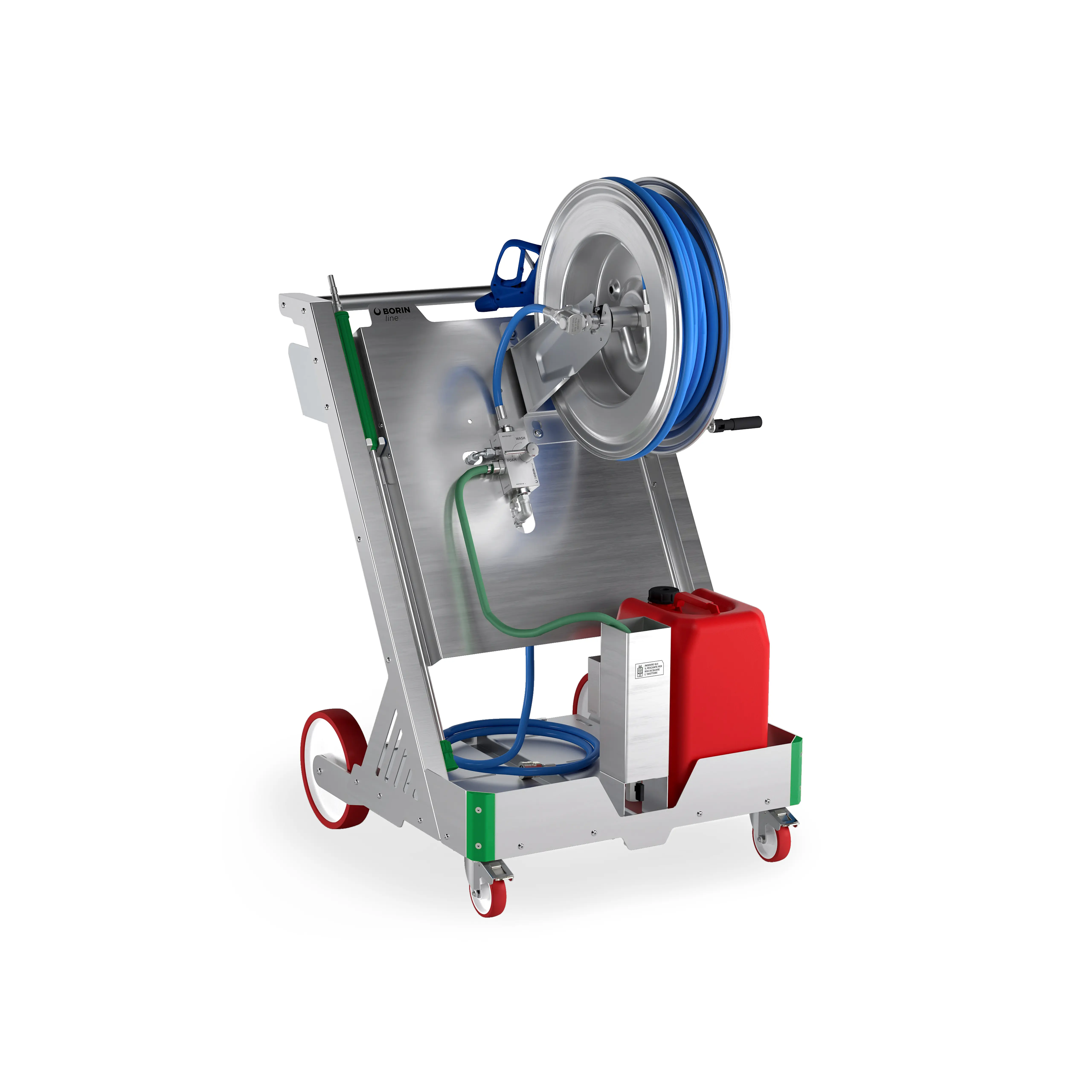 Completo di avvolgitubo a manovella per mantenere la linea ordinata durante spostamento e utilizzo, organizza la distinzione tra reparti tramite codice colore verde, con paracolpi e kit lance abbinati secondo logica HACCP.