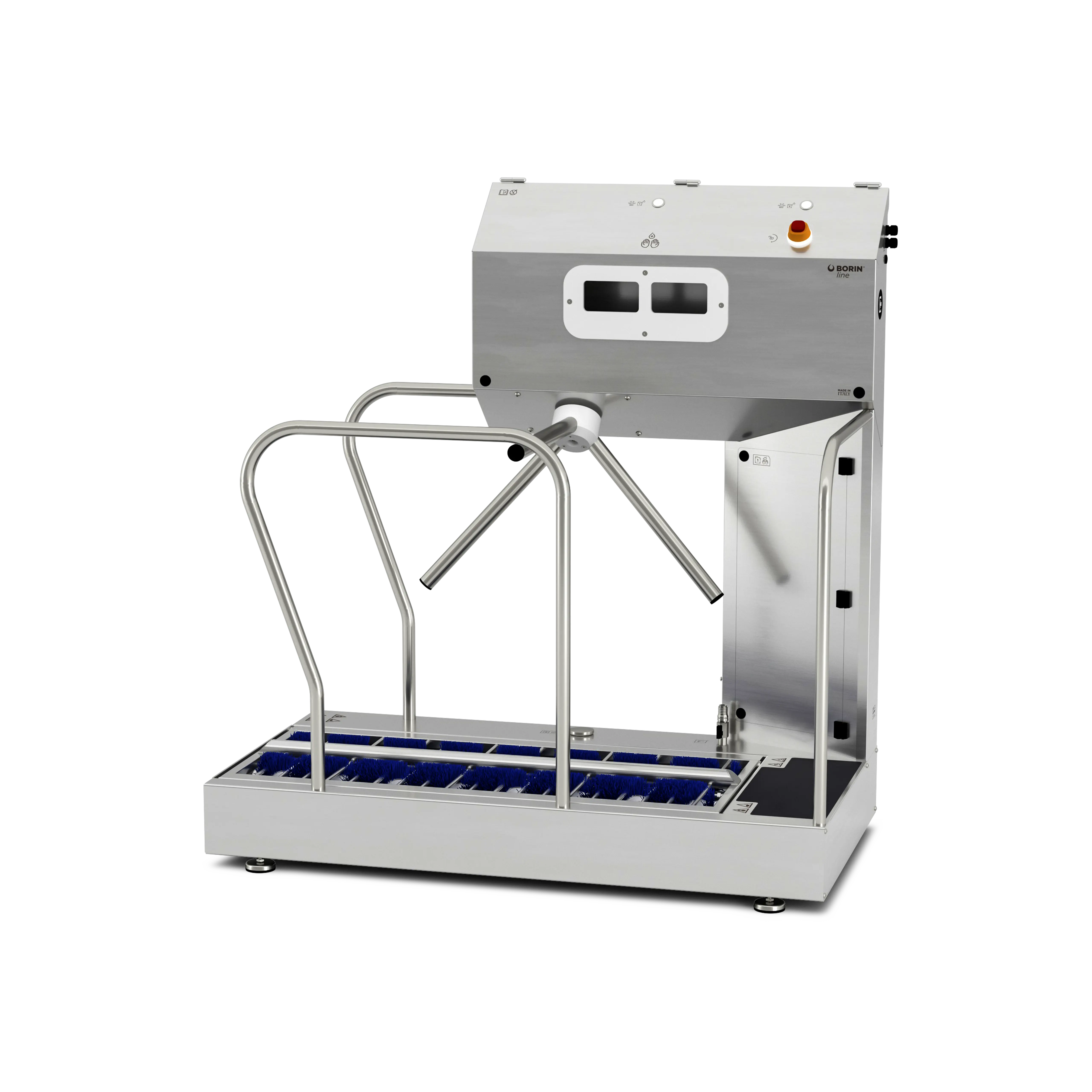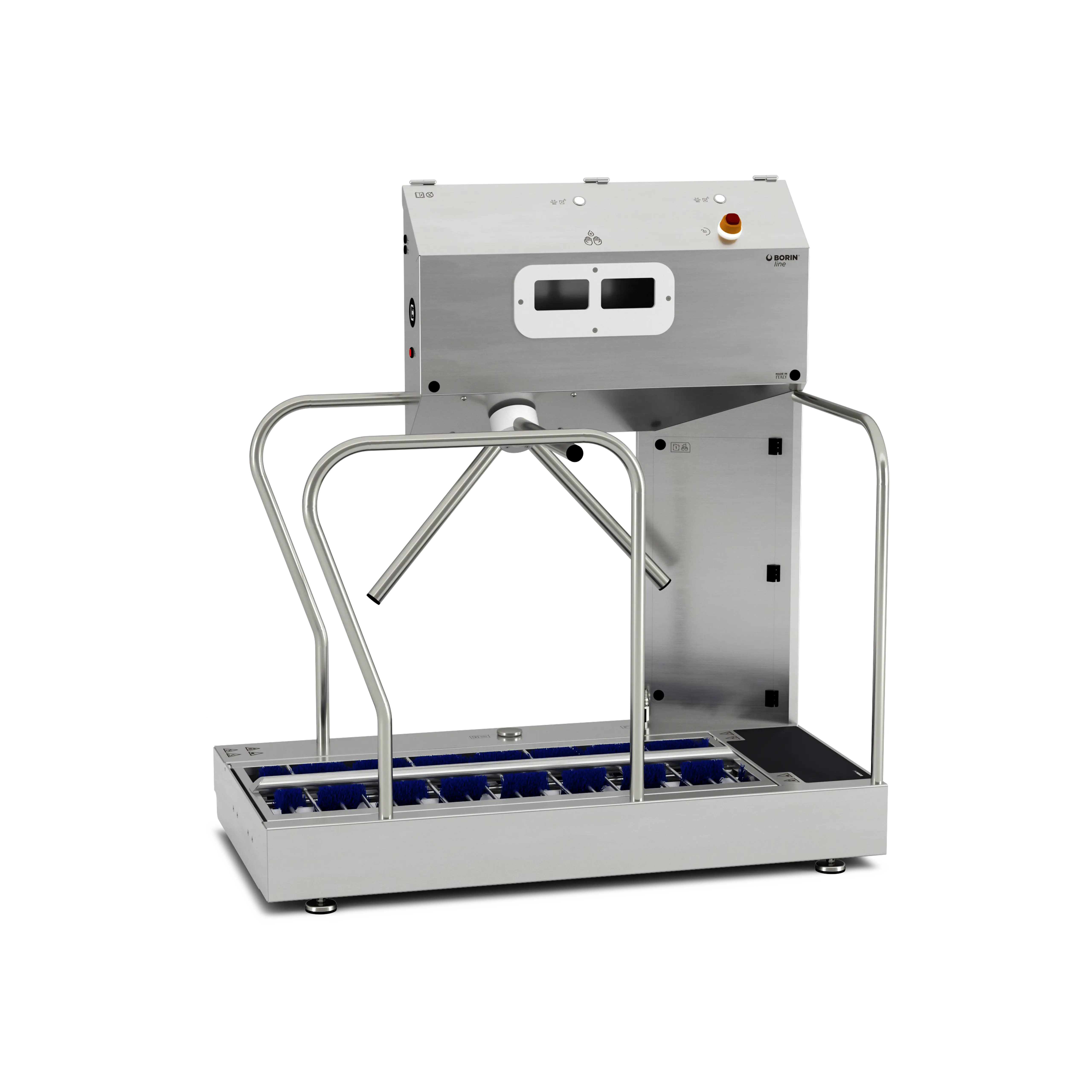 Versione Smart attivata (display e cavo ethernet). Stazione igienizzante per controllo accessi: sanifica le mani e gestisce spazzolatura, lavaggio e sanificazione delle calzature lungo il percorso, preparando l’operatore all’ingresso nelle aree produttive. Il tornello elettromeccanico vincola la persona a compiere la corretta procedura: se errata, non darà il consenso all’accesso.