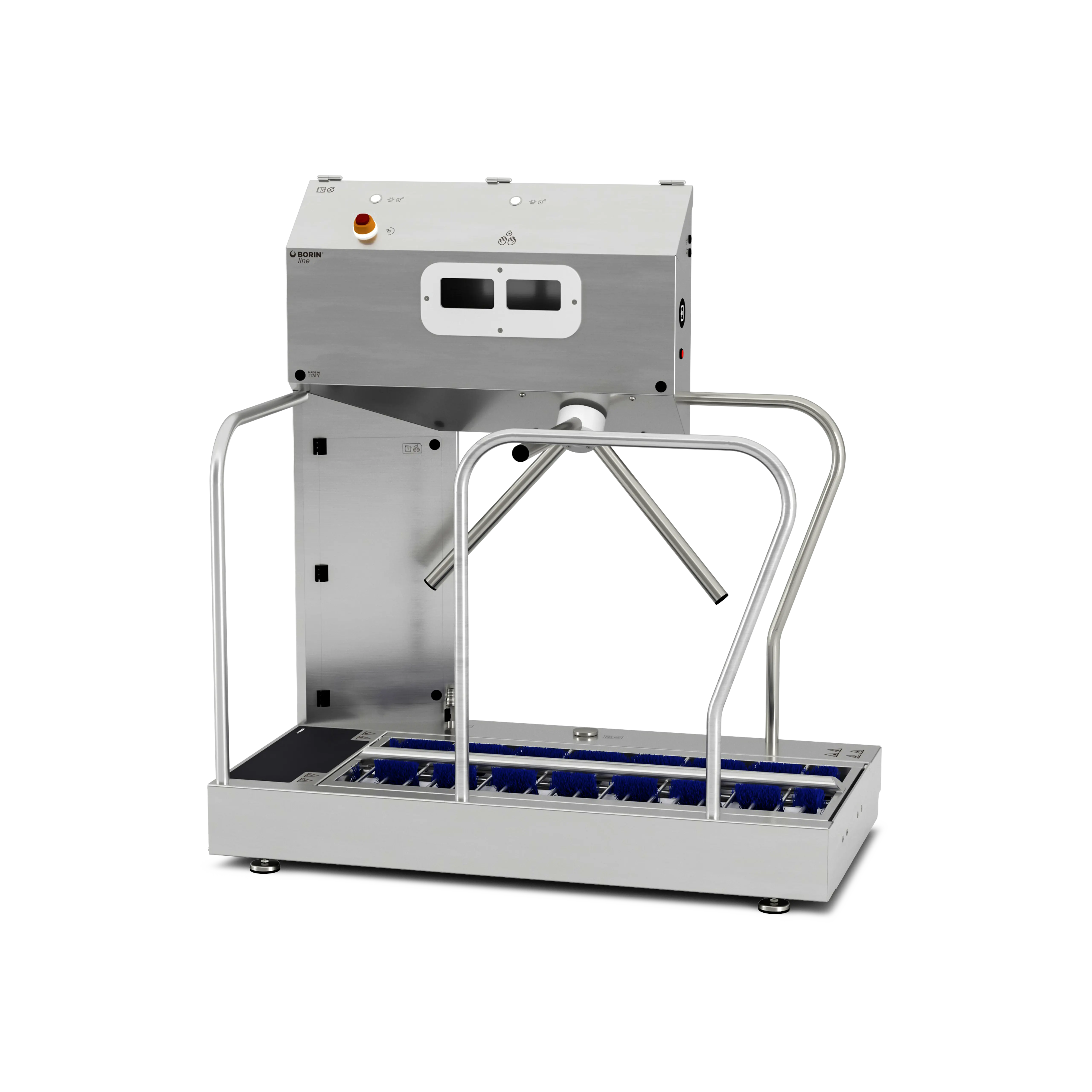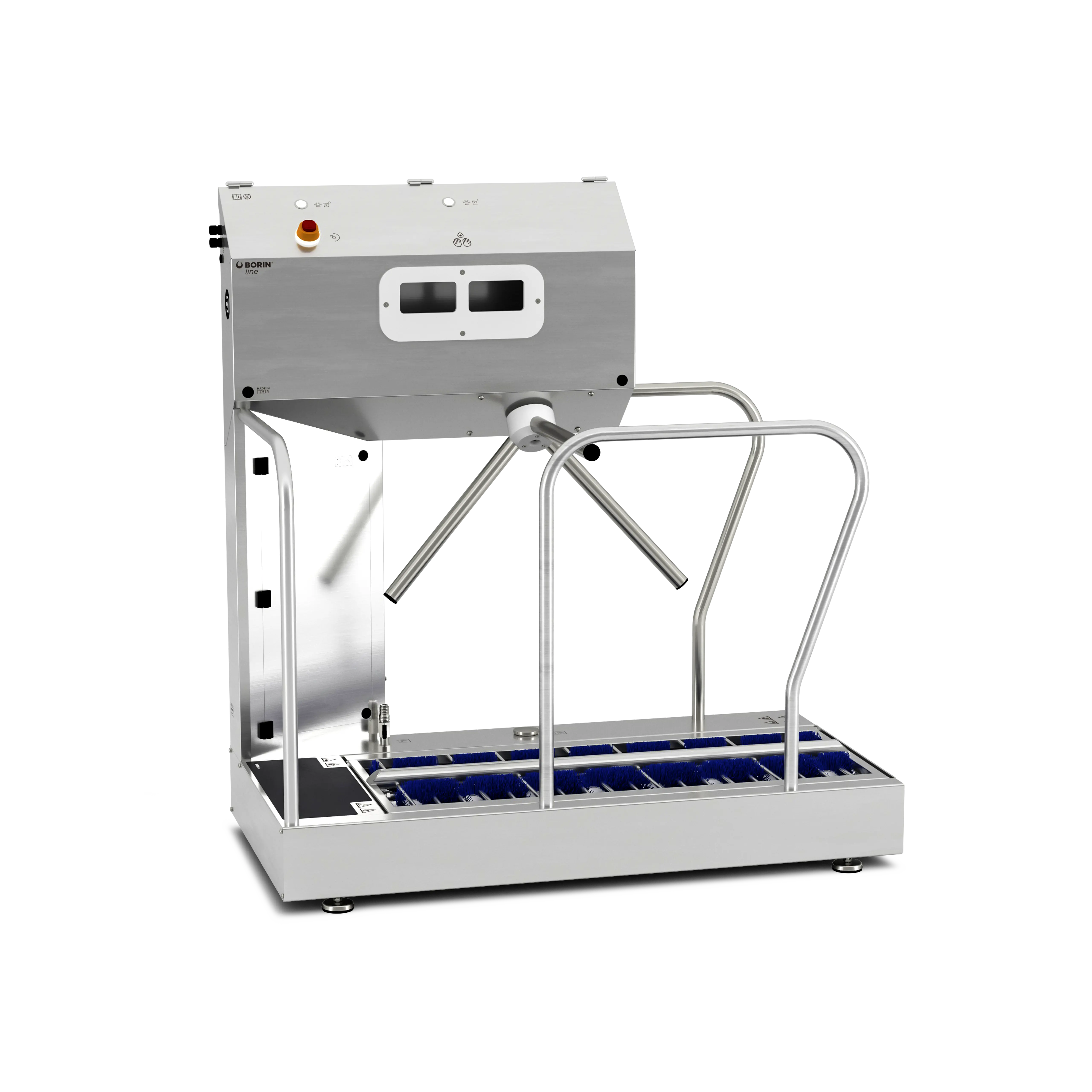 Versione Smart attivata (display e cavo ethernet). Stazione igienizzante per controllo accessi: sanifica le mani e gestisce spazzolatura, lavaggio e sanificazione delle calzature lungo il percorso, preparando l’operatore all’ingresso nelle aree produttive. Il tornello elettromeccanico vincola la persona a compiere la corretta procedura: se errata, non darà il consenso all’accesso.