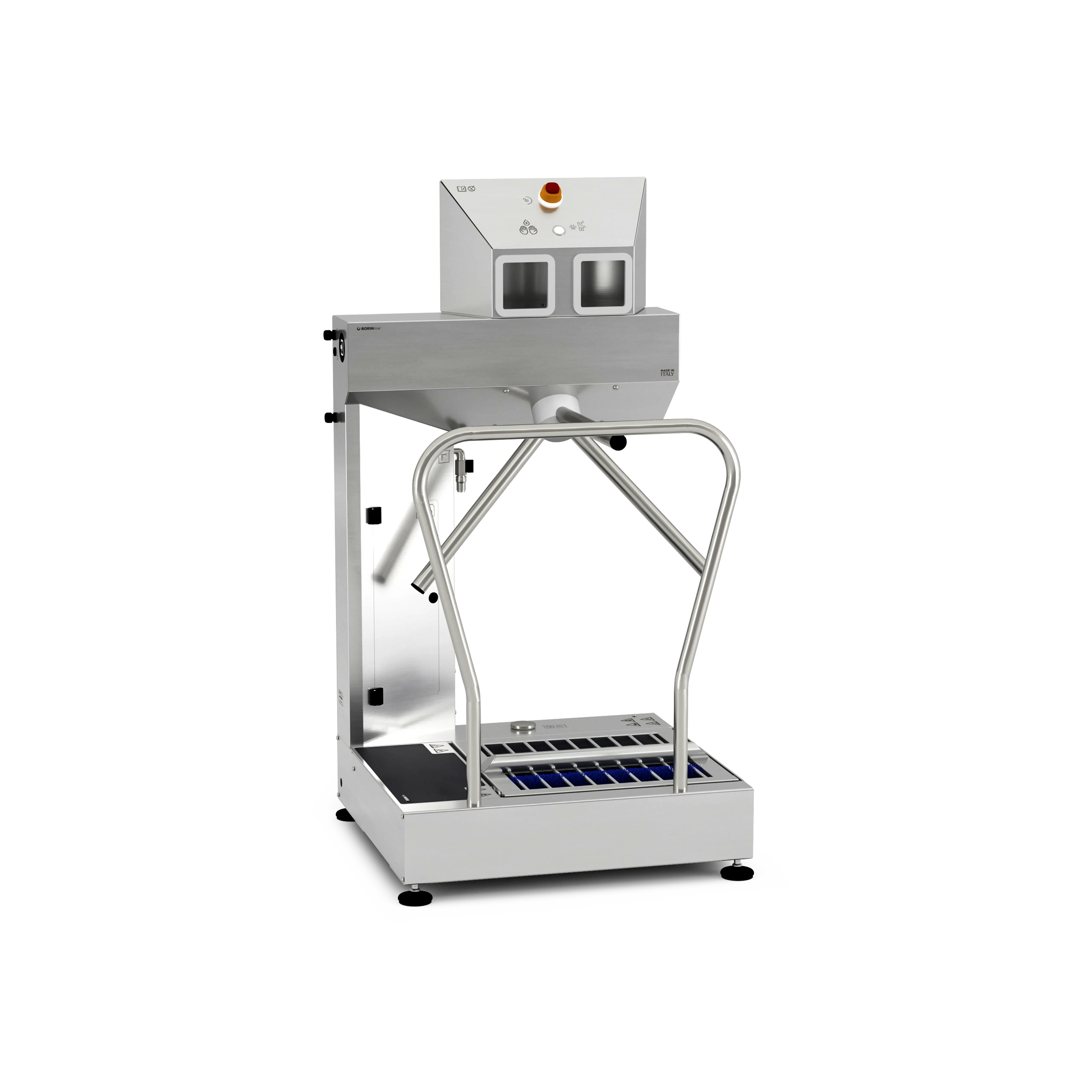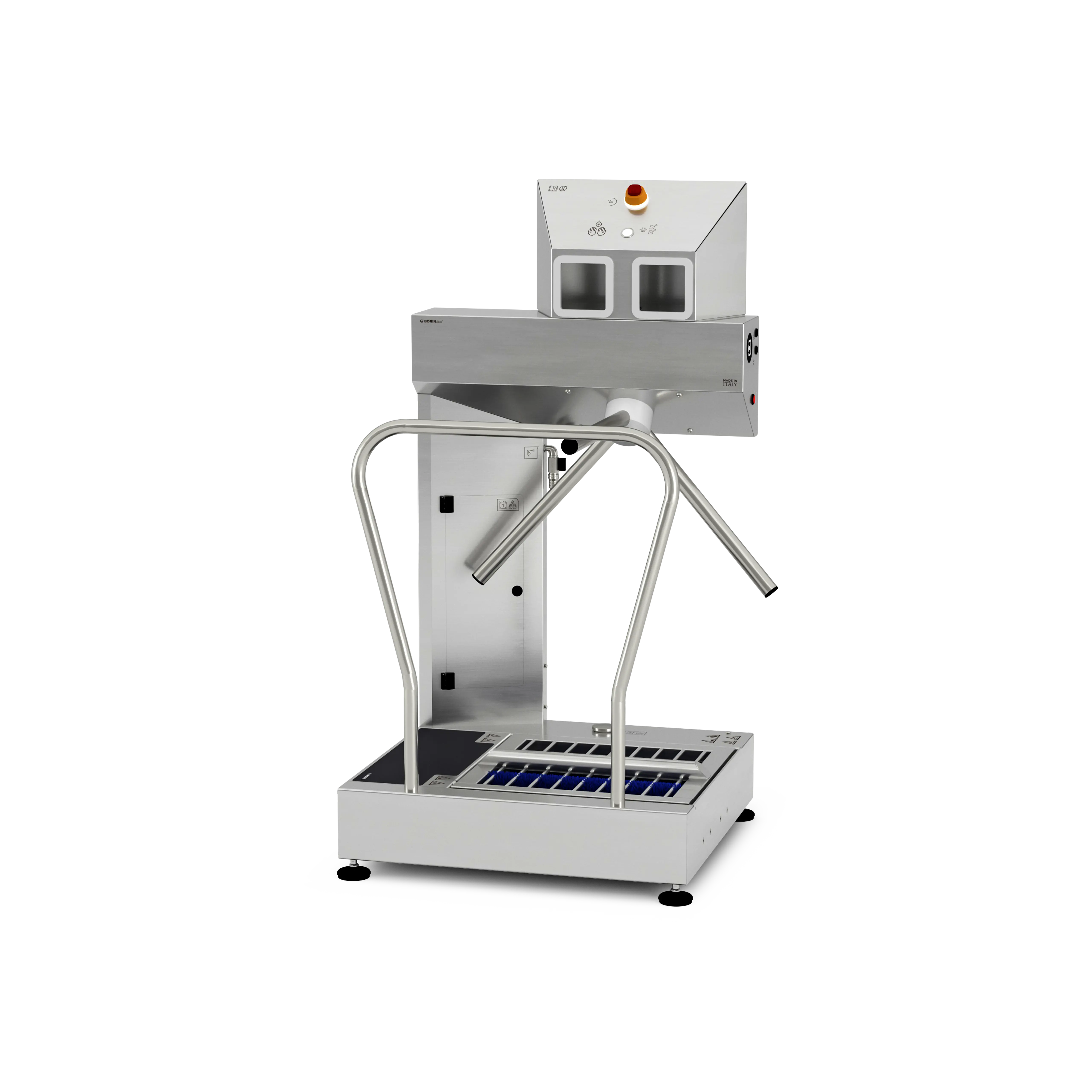Versione Smart attivata (display e cavo ethernet). Stazione igienizzante per controllo accessi: sanifica le mani e gestisce spazzolatura, lavaggio e sanificazione delle calzature lungo il percorso, preparando l’operatore all’ingresso nelle aree produttive. Il tornello elettromeccanico vincola la persona a compiere la corretta procedura: se errata, non darà il consenso all’accesso.