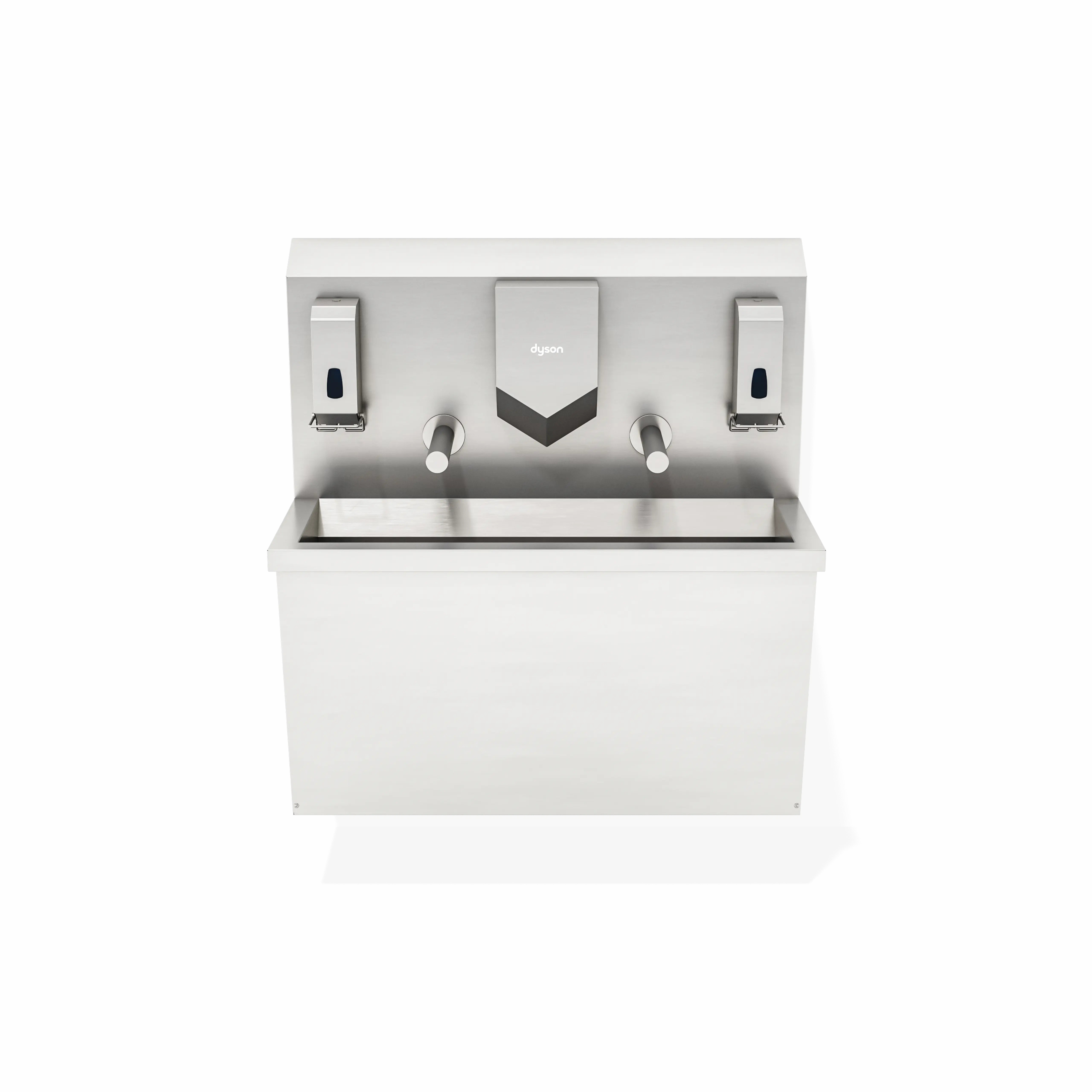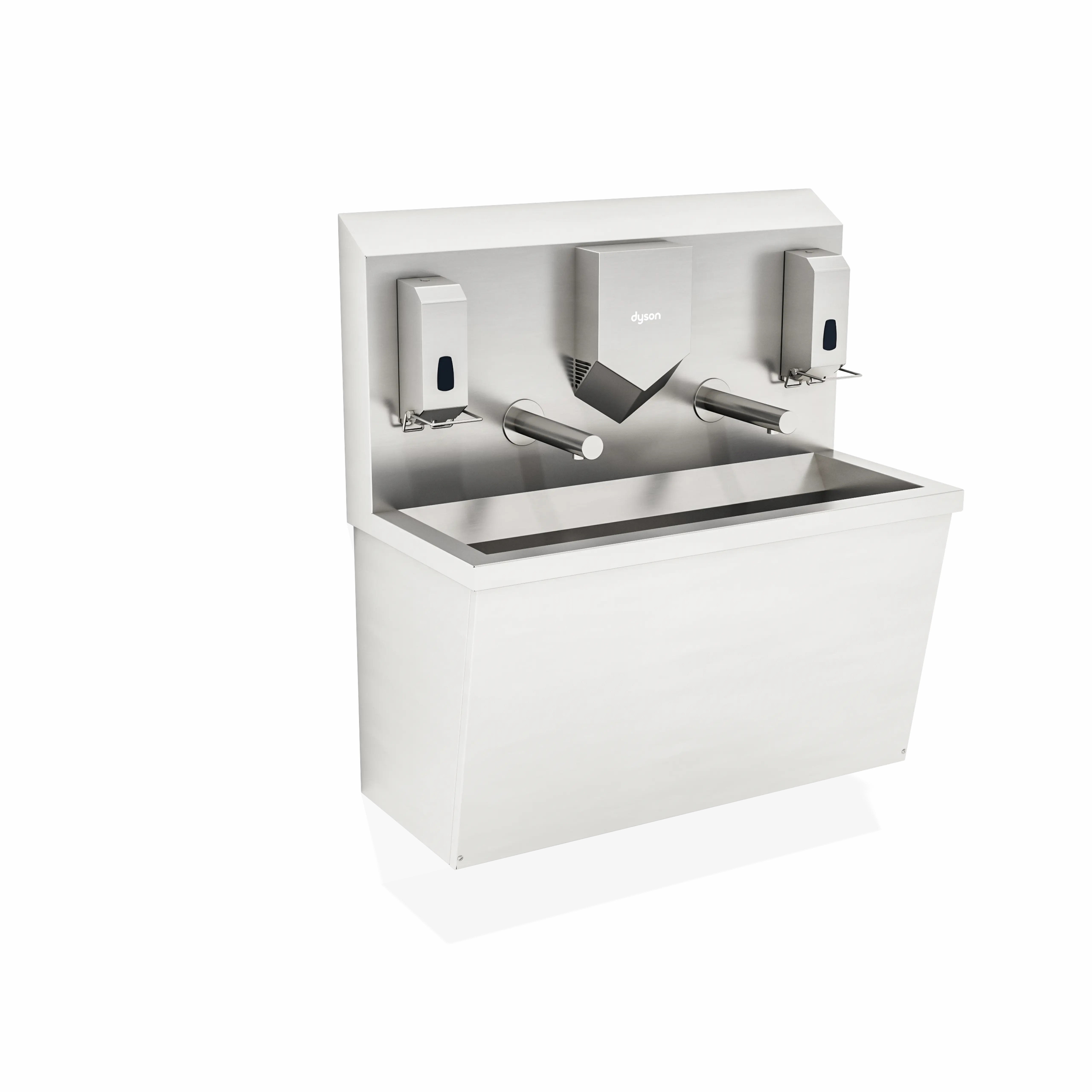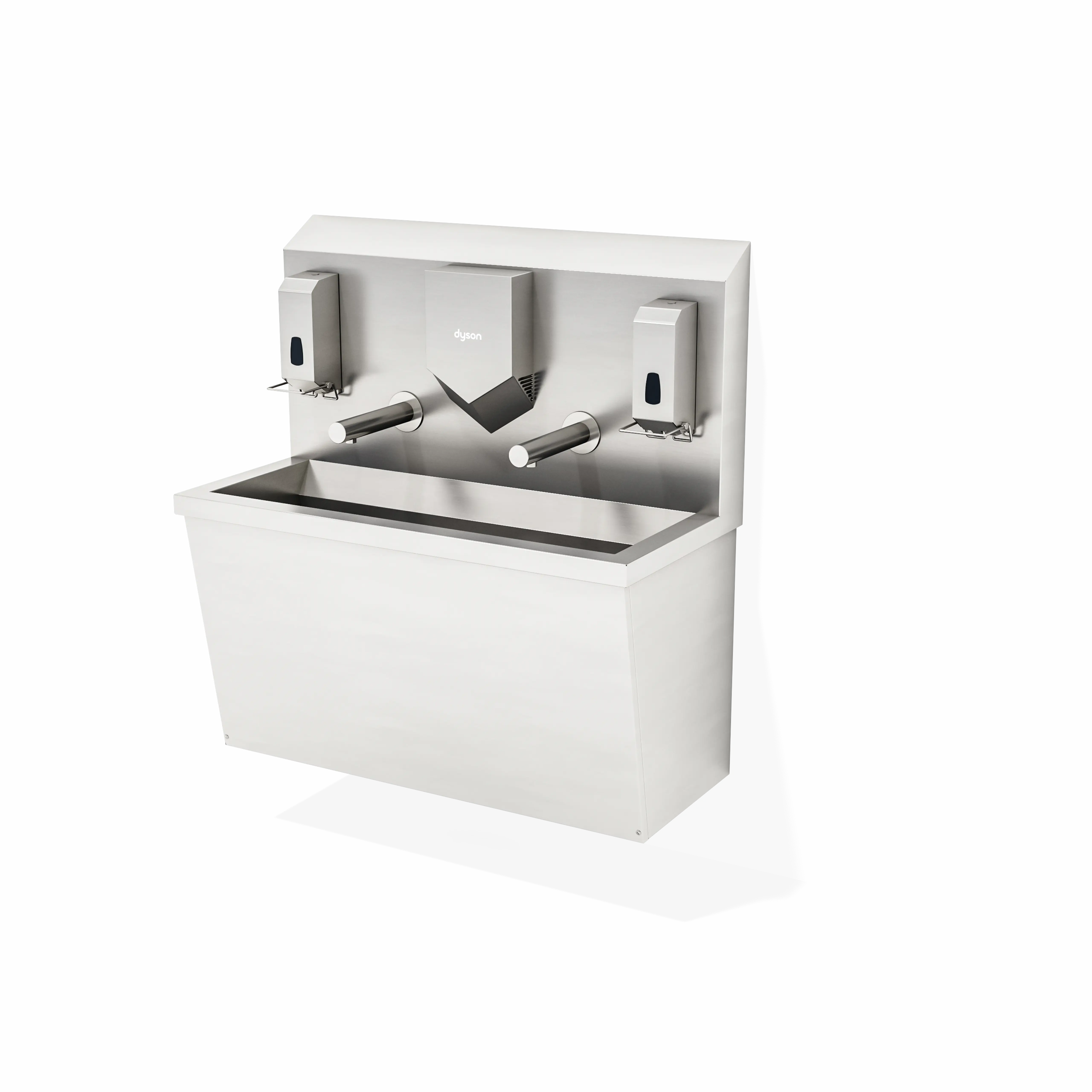 Lavandino carterizzato pensile a due postazioni, progettato per gestire flussi più elevati mantenendo ordine e igiene operativa. Il rubinetto a fotocellula riduce il contatto diretto, mentre Dyson Airblade V completa l’asciugatura. Due dispenser a gomito supportano la gestione di sapone e igienizzante in base alla procedura. È indicato anche per aree produttive ad alto rischio di contaminazione batterica, dove l’igiene operativa è un requisito essenziale.